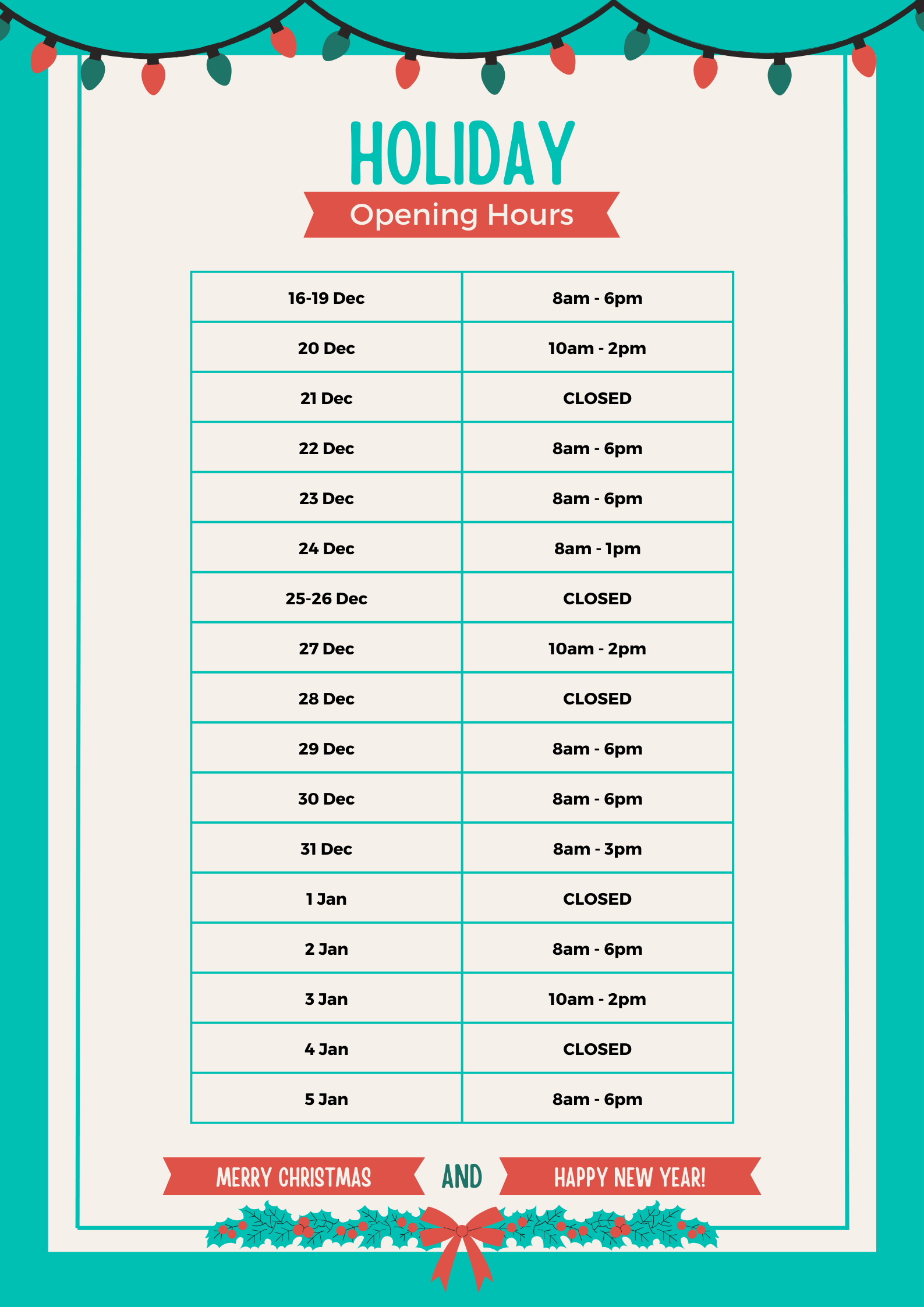 Mon – Fri: 8am – 6pm (closed for lunch 1-2pm)